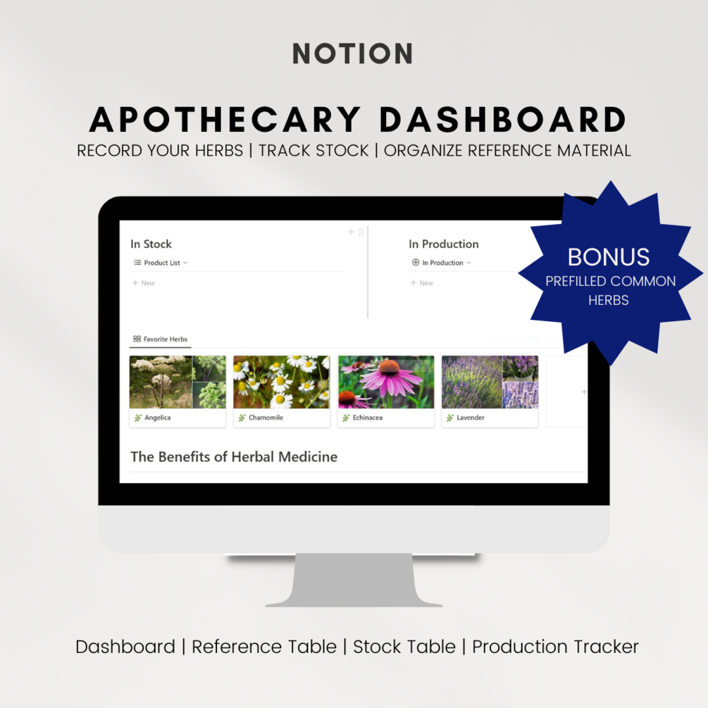 The herbal home apothecary dashboard template in Notion is an easy way to track your herbal remedies and make sure you have the medicines you need on hand. It allows you to view all of your herbal remedies in one place and provides quick access to detailed information about each remedy. The dashboard template also includes helpful date formulations that allow you to quickly analyze your inventory and determine which remedies need to be replenished. Additionally, you can customize the template with your own photos and images to make it your own. With the herbal home apothecary dashboard template in Notion, you can easily keep track of your herbal remedies and make sure you always have the medicines you need.